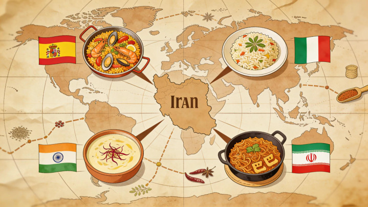 在伊朗,藏红花是烹调的灵魂。最经典的用法是制作"塔赫迪格"(Tahdig)——一种用藏红花米饭制成的锅巴,金黄酥脆,是波斯餐桌上的自恃。