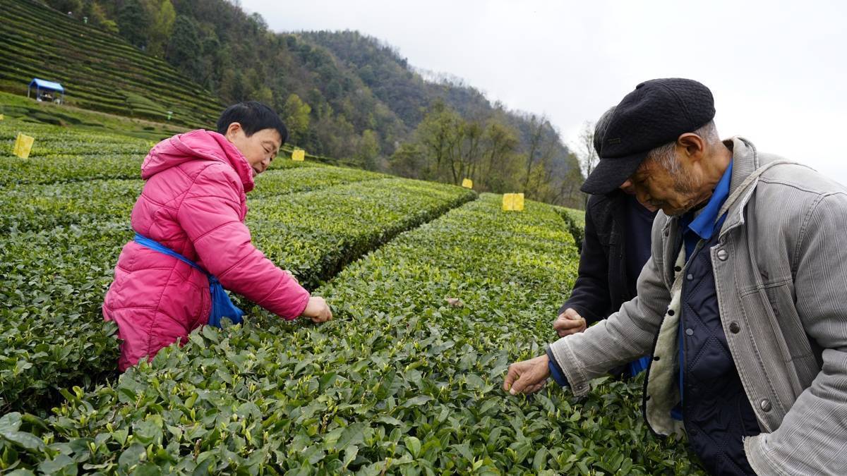 杨华川(右)正在采茶。(记者 匡柏学 摄)