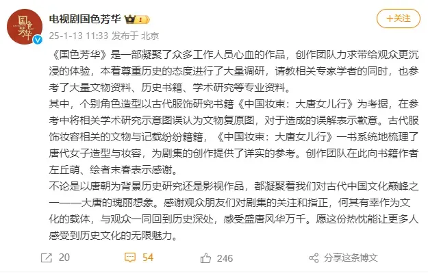 13日上昼,电视剧《国色青春》官微发文致歉。
