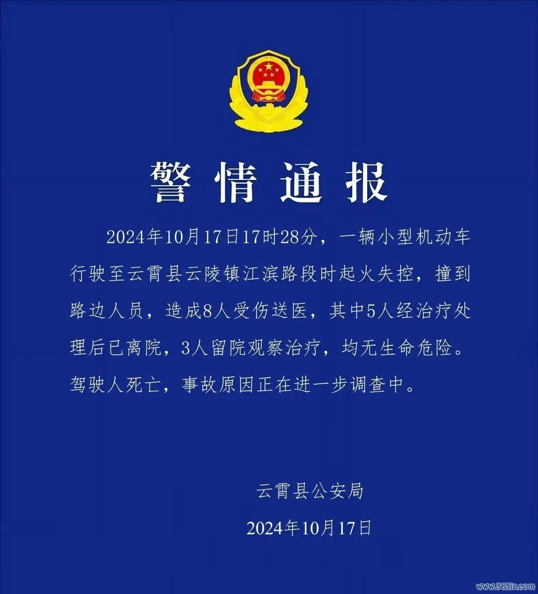 云端公安示意:“10月17日17时28分,一辆微型活泼车行驶至云端县云陵镇江滨路段时动怒失控,撞到路边东谈主员,酿成8东谈主受伤送医,其中5东谈主经调养贬责后已离院,3东谈主留院不雅察调养,均无人命危境,驾驶东谈主死字,事故原因正在进一步打听中。”
