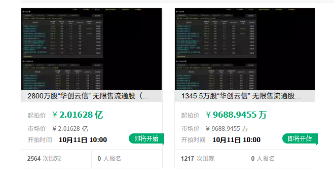 9月5日,华创云信公告称,公司推动上海杉融实业有限公司(以下简称“杉融实业”)部分股权将被国法拍卖。字据公告,这次波及股份数目为4145.5万股,占杉融实业抓股比例的34.94%,占公司总股本的1.87%。本次拍卖的4145.5万股被分为2个方向物,分袂为2800万、1345.5万,前者起拍价约2.02亿元,后者起拍价约9688.95万元。本次拍卖将在淘宝网进行,拍卖肇始时辰是10月11日,为期一天。