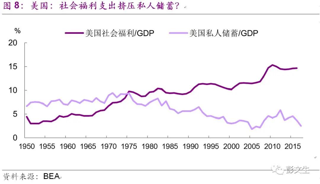 这就波及到好意思元的汇率问题和好意思国的交易差额相对中期的一个不雅点。我刚才提到从宏不雅经济平衡来讲,交易差额是储蓄和投资之差,如果关税不影响好意思国的储蓄率和投资率的话,那么势必意味着好意思元增值,抵消交易条目改善的影响,使得好意思国的交易差额不变。这就带来一些问题,到底什么要素决定了好意思国的储蓄率和投资率?最近我在青岛干与中国钞票论坛,今日早上格林斯潘从好意思国视频讲中好意思交易摩擦的影响发了一个图,他认为加关税没用,不会镌汰好意思国的交易逆差,原因是什么呢?他认为好意思国的交易逆差和好意思国的社会福利开销关接洽,好意思国在往时几十年社会福利开销越来越多,跟着好意思国社会福利开销加多,好意思国私东谈主部门的储蓄率下跌,是以他的交易逆差就加多了(见图8)。