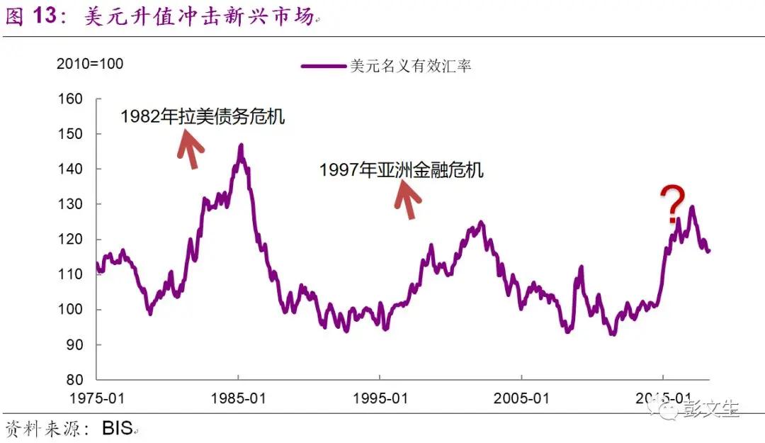 也便是说咱们可能在去杠杆紧信用这个大环境下,多了来自外部的紧信用的影响,但这不一建都是赖事情。假定咱们经济还可以,外债带来的信用紧缩对去杠杆是善事情,但如果里面信用条目也曾很紧了,这时候再加个外部冲击,那这个影响可能不是好的了。我个东谈主认为,总体来讲不是赖事情。因为往时这几年,主如果国企和房企是主要的好意思元债务东谈主,这个信用紧一紧,对国企降杠杆、对防控房地产的风险是有匡助的。另一方面,前边提到,中好意思之间交易摩擦不是两国的,是好意思国和以中国为代表的其他交易伙伴之间的,再加上好意思元的国际货币地位,好意思元对东谈主民币的增值可能会对新兴市集带来一些冲击(见图13),天然这要看将来扫数这个词交易摩擦演变的旅途。