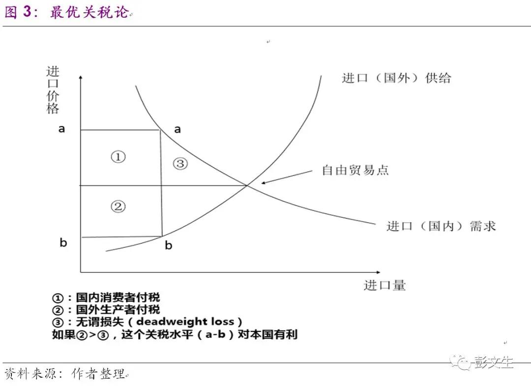 那么最优关税表面是何如来的?咱们可以看一下图3,横轴是入口的量,纵轴是入口的价钱,向下歪斜的弧线是入口需求,比如好意思国国内对入口的需求,入供词给比如说中国提供给好意思国的入口,这条弧线是往上歪斜的,这两条弧线的交叉点便是解放交易平衡点。所谓的最优关税表面,在这个解放交易点的落魄征收一个关税,征收关税的末端使得入口的需求价钱和入口的供给价钱不一样了,酿成一个是a,一个是b,a和b的差距价钱就酿成关税交给好意思国政府了。这个关税是不是合理的呢?按照最优关税论的分析,我标①的部分便是好意思国国内糟践者给好意思国政府交的税,②的部分是他国的出产商交给好意思国政府的税,体现为出产商供货价钱下跌了。源流平衡的价钱是解放交易的价钱,但加关税以后为了保管对好意思国一定的出口,中国的出产商可能把供货价钱降下来,降到低于解放交易点的位置。