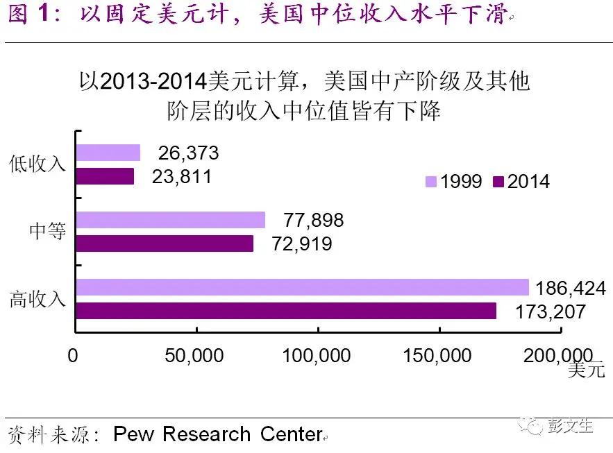 那为什么在这个时刻点中好意思交易摩擦成为一个问题?中国对好意思国的交易顺差酿成很大的争议点?这背后天然有政事、国际环境变化的要素,但根底原因照旧响应了中好意思经济相对的变化,尤其是好意思国国内不同社会阶级的分化。这里有一个统计分析,2000-2014年间好意思国229个都市区有203个的中产阶级数目萎缩。如果以骨子收入来操办的话好意思国不同阶级的中位数收入是下跌的(见图1),而平均数可能高涨,这背后的原因便是贫富差距加大,这是好意思国国内的配景。特朗普的维持者多为是白东谈主中产阶级,他们在往时二三十年交易解放化的程度中可能嗅觉受损最大,天然这不仅是国际交易的问题,期间越过、金溶化放化等要素都有影响。但一般来讲,把这个办事推给番邦东谈主更为容易。