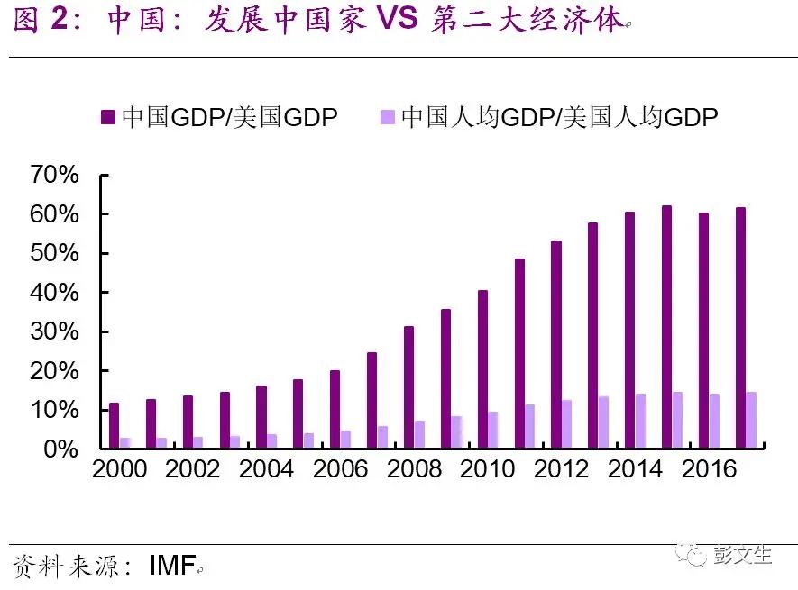 中国和好意思国占全球GDP的比重此消彼涨,就中国经济的定位来讲是种十分特殊的情形。从东谈主均GDP来讲,中国唯有好意思国10%多少许,咱们照旧典型的中等收入发展中国度。但同期咱们又是第二大经济体,经济边界大(见图2),导致咱们的经济边界和发展水平之间的反差。