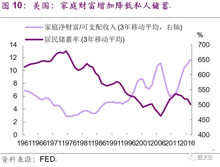 为什么好意思国私东谈主部门的储蓄率会受社会福利开销的影响呢?便是政府给低收入阶级的社会保险维持和福利开销,钱给到低收入阶级之后,他们的糟践倾向高,是以平均来讲,资源没变,但扫数这个词社会的糟践多了,是以交易逆差就多了。这是和好意思国政府财政的二次分派关接洽的,图9体现好意思国住户的可控制收入和市集分派收入的永逝。我不太招供格林斯潘的这个不雅点,将交易逆差归责于对穷东谈主的匡助是有问题的,还有其它方面的原因。比如说好意思国度庭钞票的加多镌汰了私东谈主储蓄,咱们为什么要储蓄?储蓄是为了积蓄资产,如果我的资产价值高涨了,就没那么大能源加多储蓄。假如说你买的股票霎时翻了一倍,钞票大幅加多,你未来可能就买一辆新车,你的糟践举止就发生了变化。