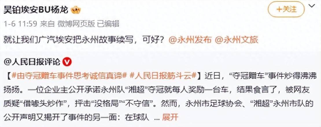 记者此前报说念,1月6日,广汽埃安首席用户官杨龙微博共享东说念主民日报评述《由“夺冠赠车”事件念念考诚信真义》并发文:就让咱们广汽埃安把永州故事续写,可好?