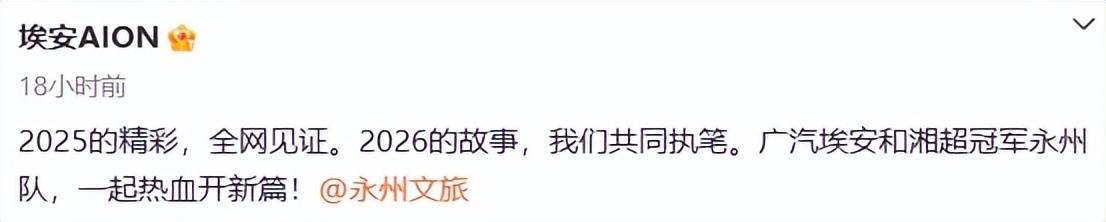 1月7日晚,广汽埃安和永州文旅微博同步发声:2025的精彩,全网见证。2026的故事,咱们共同捏笔。广汽埃安和湘超冠军永州队,全部热血开新篇!