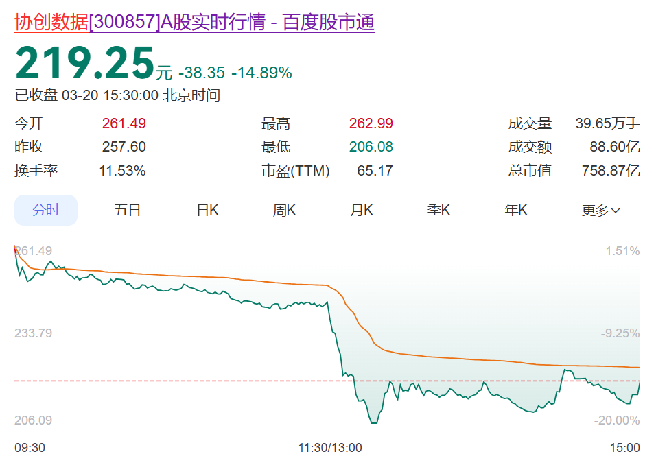 另一家被神话波及的是A股算力巨头协创数据(300857.SZ),该公司午后股价瞬息跳水,一度20cm跌停,升天收盘跌近15%,报收219.25元,总市值758.87亿元。