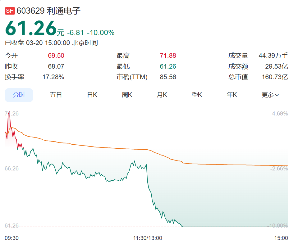 该神话波及多家A股公司,激发关系公司股价大跌。本日午后,利通电子(603629.SH)股价瞬息跌停,报收61.26元,总市值160.73亿元。