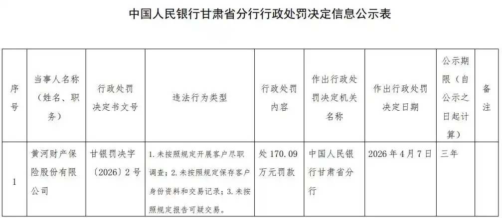 4月13日,中国东说念主民银行甘肃省分行表示的行政处罚决定信息公示表泄漏,黄河财产保障股份有限公司(下称“黄河财险“)因波及未按国法开展客户尽责拜访、未按国法保存客户身份贵府和交往记载,以及未按国法陈述可疑交往三项坐法活动,被处以170.09万元罚金。
