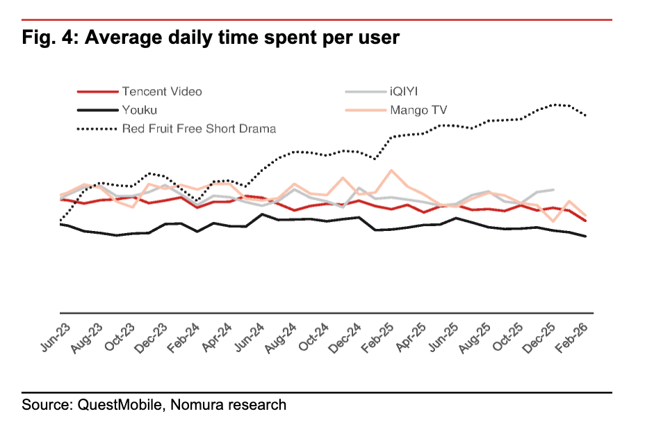 证据野村援用的QM数据,优爱腾芒二月用户使用时长(MTS)同比分别下跌了26% 、27%、30%和54%,红果短剧MTS则是暴涨了155%,DAU也录得翻倍。